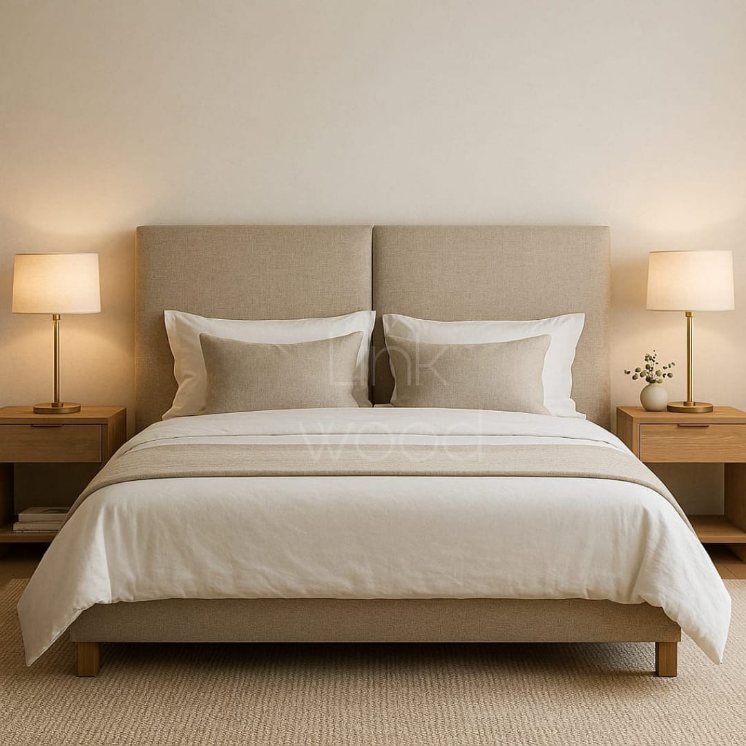 Minimal elegance meets timeless comfort in the Sahara Bliss Bed Set. Featuring a soft-beige upholstered headboard with clean vertical division and matching base frame, this bed is crafted for serene modern interiors. The warm wooden side tables with sleek drawer pulls and elegant gold-based lamps complete the soothing, natural palette — perfect for minimalist bedrooms that prioritize calm and style.
